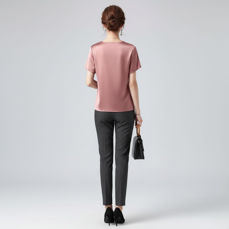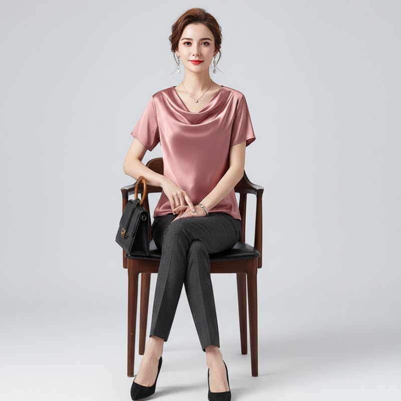 A Blusa De Seda Feminina Rosa Caryne traz o equilíbrio perfeito entre delicadeza e elegância, garantindo um caimento leve e confortável que valoriza a silhueta.