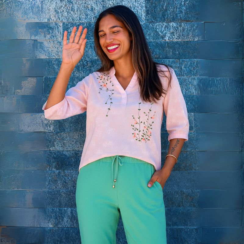 Sinta-se fresca e elegante ao usar esta blusa. Seu tecido de laise proporciona um conforto excepcional, combinando perfeitamente com a elegância dos bordados feitos com carinho.