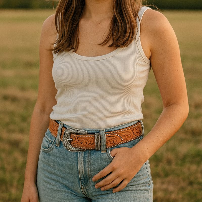 O Cinto Country Feminino Marrom Claro Boiadeira é a peça que traduz a alma do campo em cada detalhe. Com acabamento entalhado em alto-relevo, rebites metálicos e uma fivela ricamente trabalhada, ele é sinônimo de autenticidade, feminilidade e força.