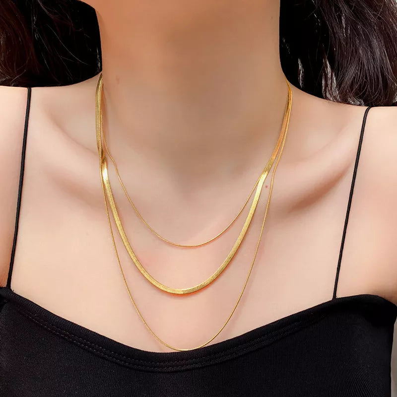 Colar Trio Camadas Malha Banhado em Ouro 18K Angela apresenta um design elegante e sofisticado, com três camadas de malha banhadas em ouro 18K. Perfeito para adicionar um toque de brilho e glamour ao seu visual, este colar é uma peça versátil que combina com qualquer roupa. Ideal para quem busca um acessório de qualidade e estilo.
