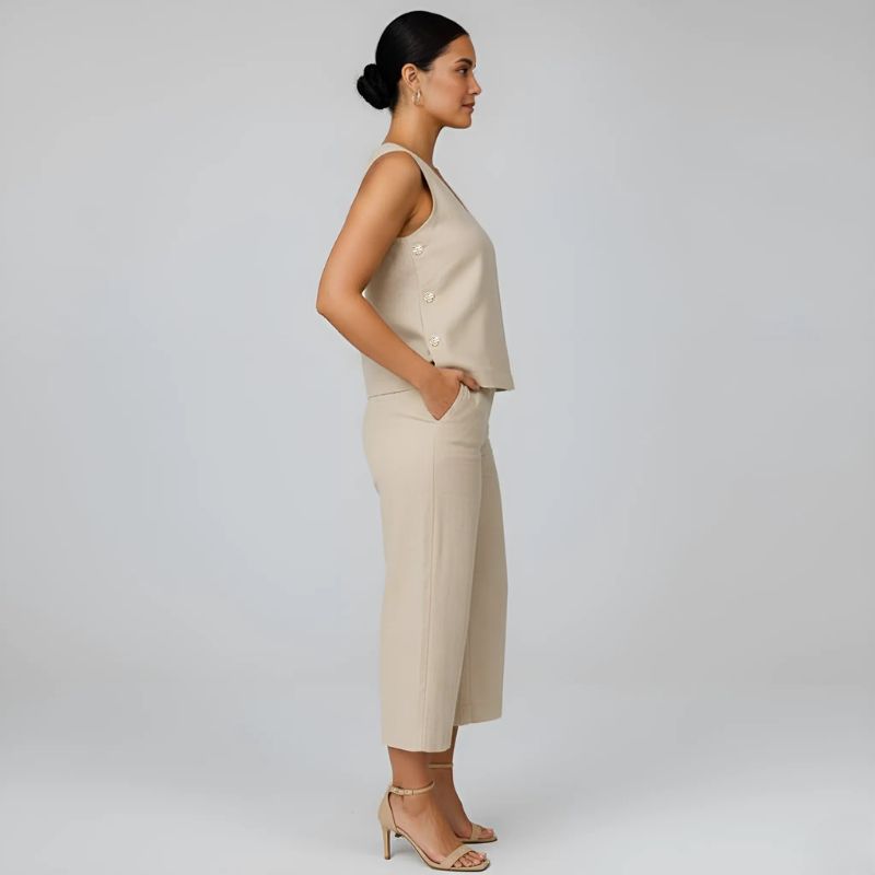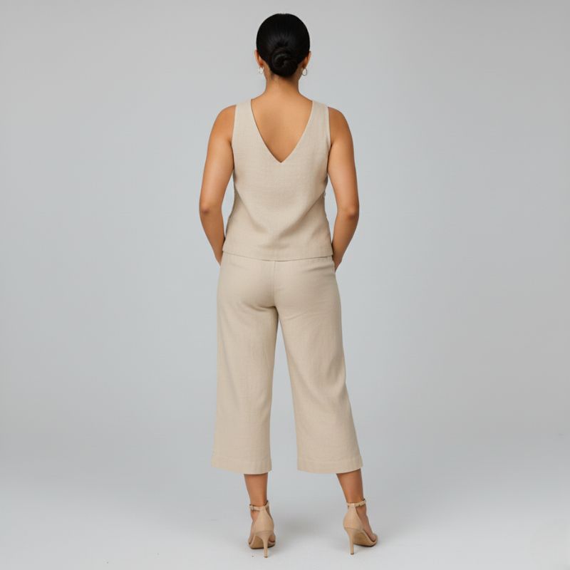 O Conjunto Feminino Alfaiataria Linho Magda foi pensado para mulheres que buscam sofisticação, leveza e versatilidade em um só look. Feito em linho cru, e encorpado com caimento impecável, ele eleva o visual sem esforço.
