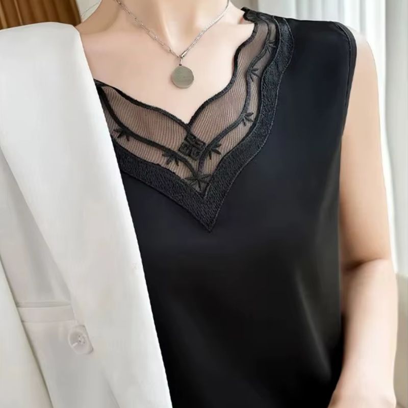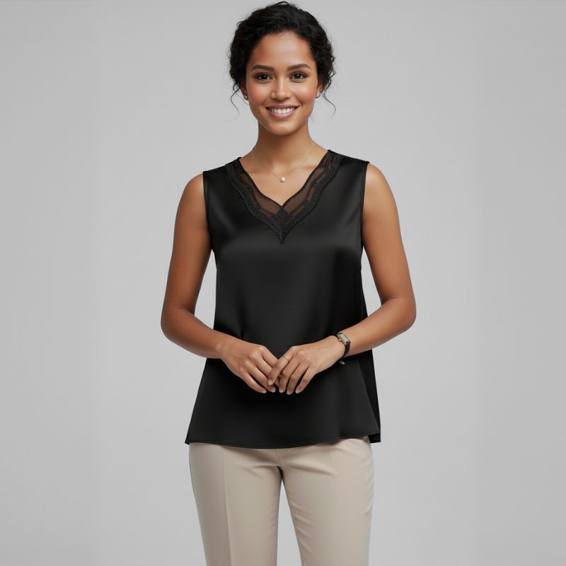A Regata Feminina De Seda Heidi foi criada para mulheres que desejam unir elegância e praticidade no dia a dia. Seu tecido nobre, com caimento leve e toque acetinado, garante frescor e conforto, enquanto o detalhe em renda no decote adiciona um charme sofisticado à peça.