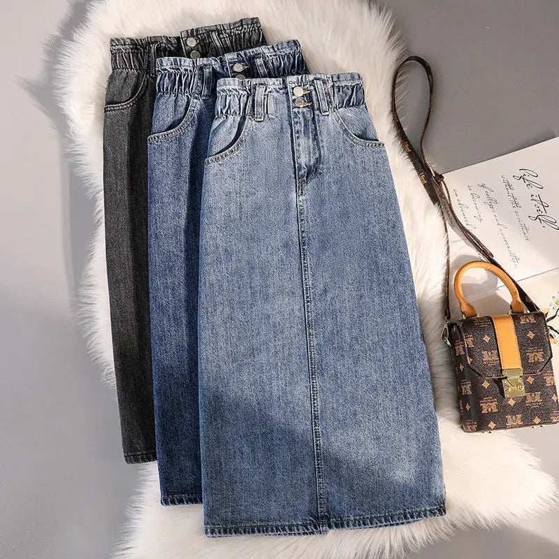 Complemente seu visual com a Saia Jeans Midi Com Fenda Carol: