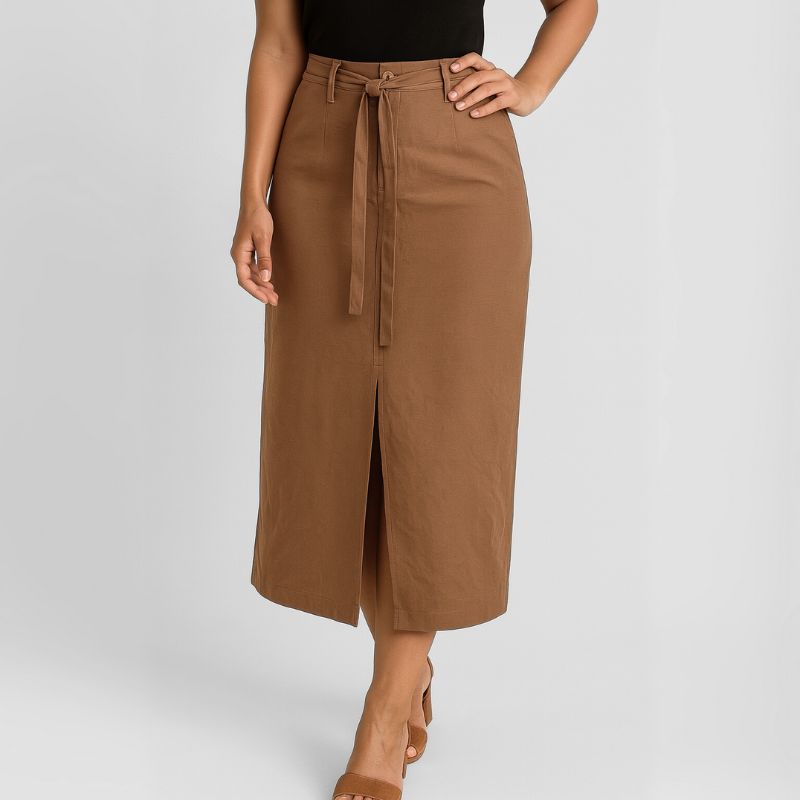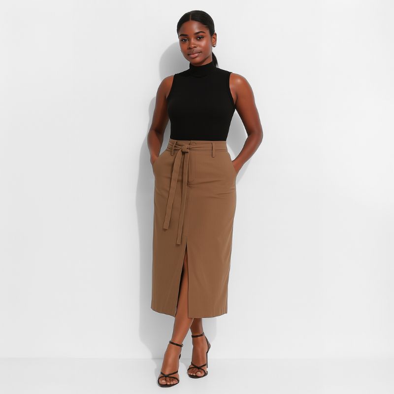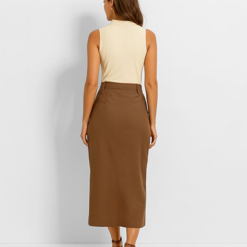 Garanta Agora A Sua Saia Midi Alfaiataria Marrom com Fenda Gabi E Vista A Elegância Que Fala Por Você.