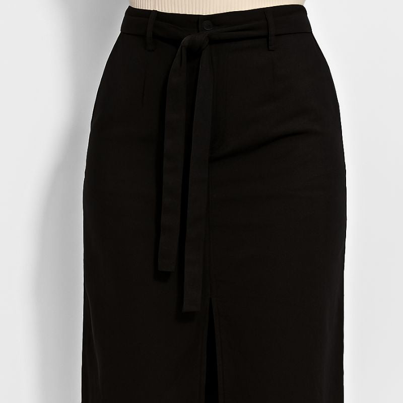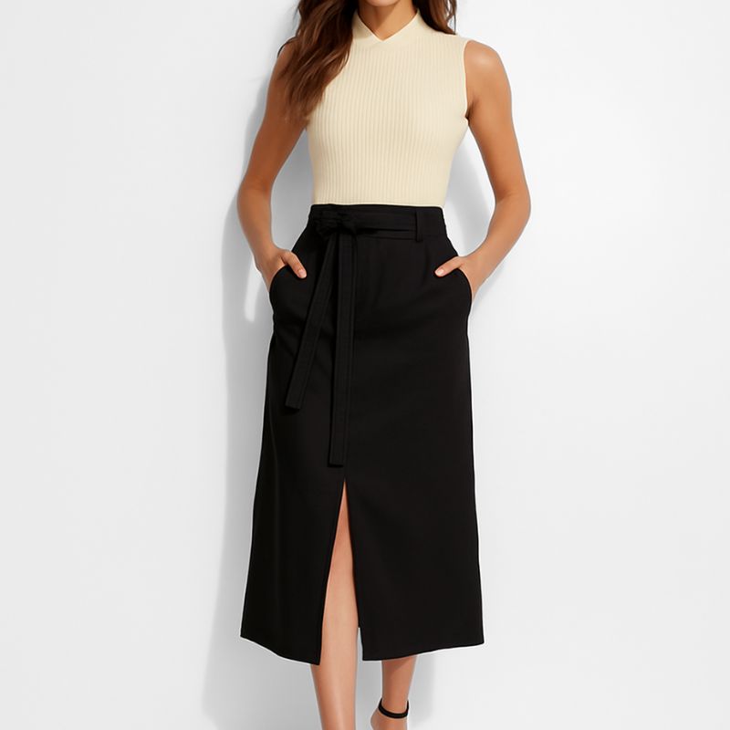 A Saia Midi Alfaiataria Preta Com Fenda Gabi é a definição de elegância moderna. Com corte preciso e caimento impecável, ela une estrutura e feminilidade em um equilíbrio perfeito.