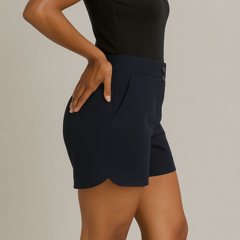 O Short Alfaiataria Azul Paula é ideal para quem busca um visual refinado sem abrir mão do conforto. Com cintura alta, dois botões frontais e corte estruturado, ele valoriza a silhueta e combina com camisas, blusas e blazers.
