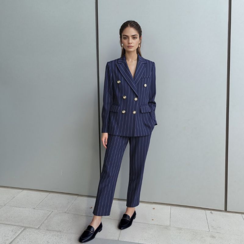 O design impecável com listras finas alonga a silhueta e proporciona uma aparência elegante e moderna, perfeita para ambientes profissionais ou ocasiões especiais.