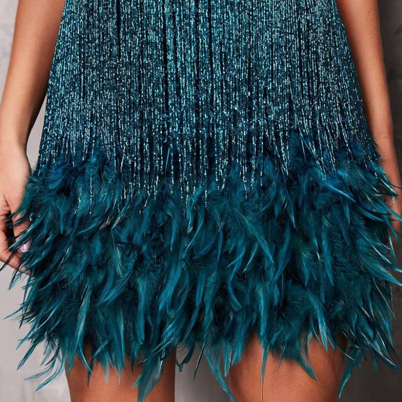A barra com acabamento em plumas dá o toque final de luxo e sofisticação, transformando o vestido em uma peça única, perfeita para quem ama o inesperado.