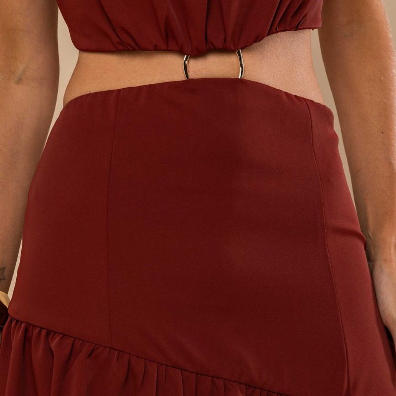 O recorte na cintura com detalhe em argola metálica traz personalidade e diferenciação, criando um visual marcante e elegante.