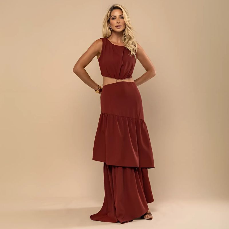 Com caimento fluido em camadas e comprimento longo, o vestido alonga a silhueta e garante movimento refinado a cada passo.