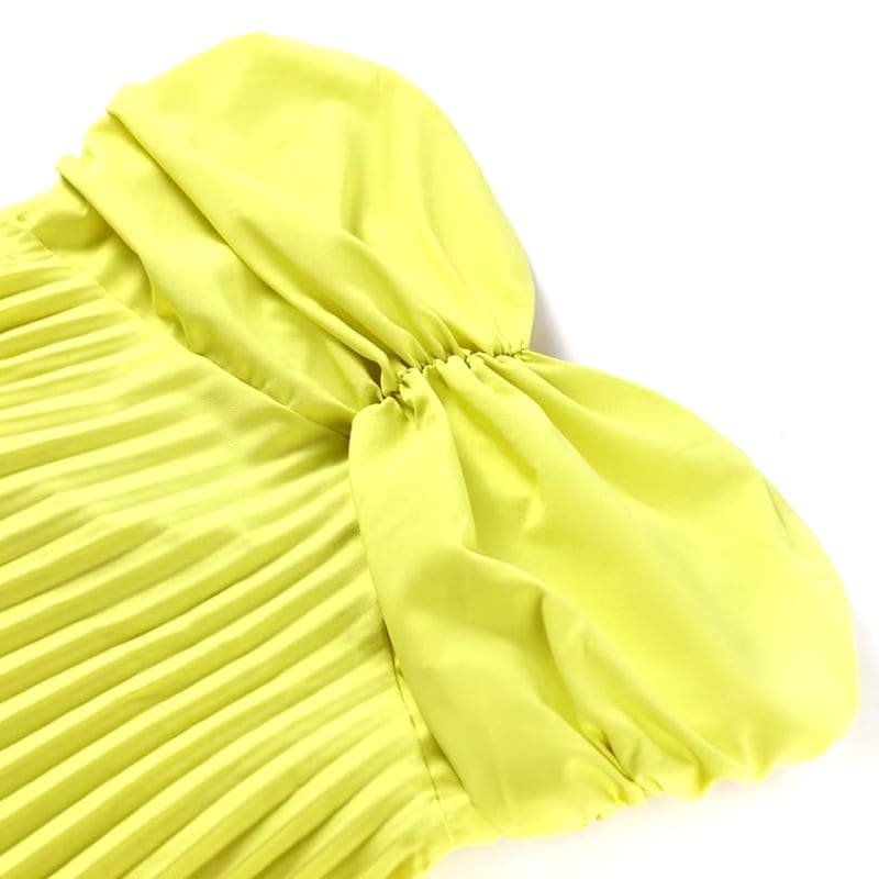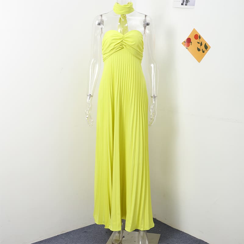 O trabalho plissado em todo o comprimento do vestido cria movimento fluido e um caimento impecável, trazendo charme e delicadeza a cada passo.