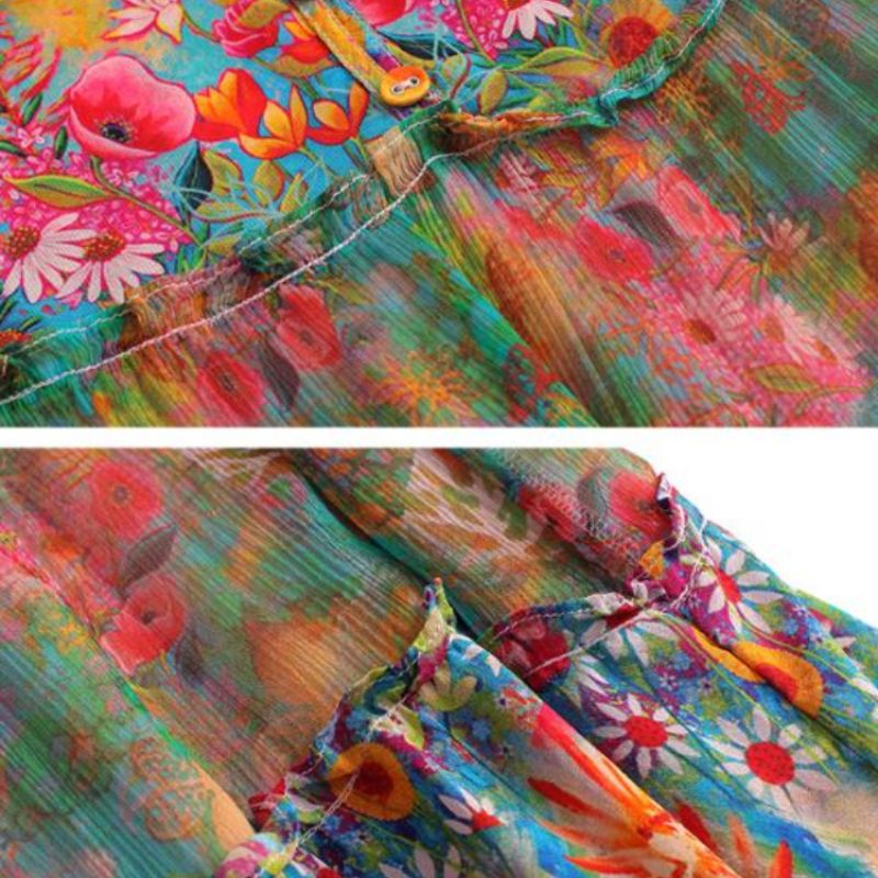 Com uma explosão de cores e flores, a estampa transmite alegria e personalidade, fazendo deste vestido uma peça única e cheia de vida.