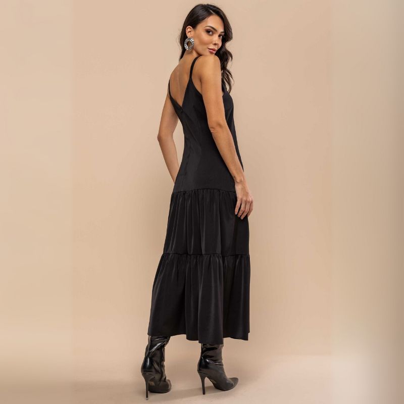 Com alças finas e decote discreto em V, o modelo alonga a silhueta e garante um visual elegante e feminino. A saia em camadas adiciona movimento e leveza, criando um toque de modernidade ao clássico vestido preto.