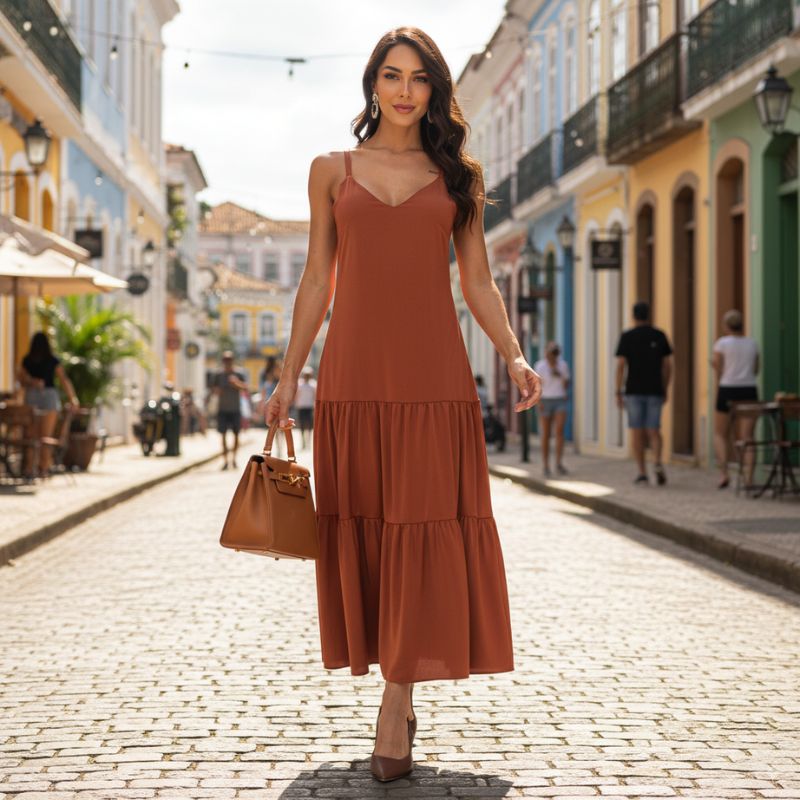 O Vestido Midi Elegante Terracota Fabi é a escolha perfeita para quem busca sofisticação, conforto e versatilidade em uma única peça.