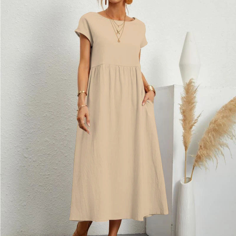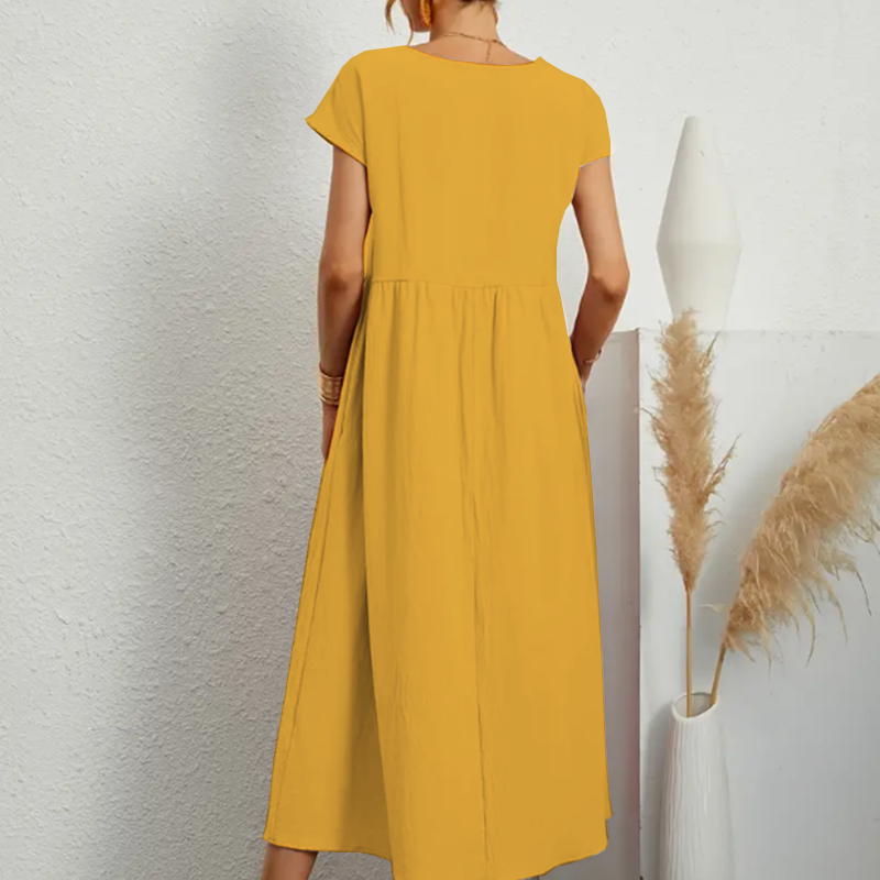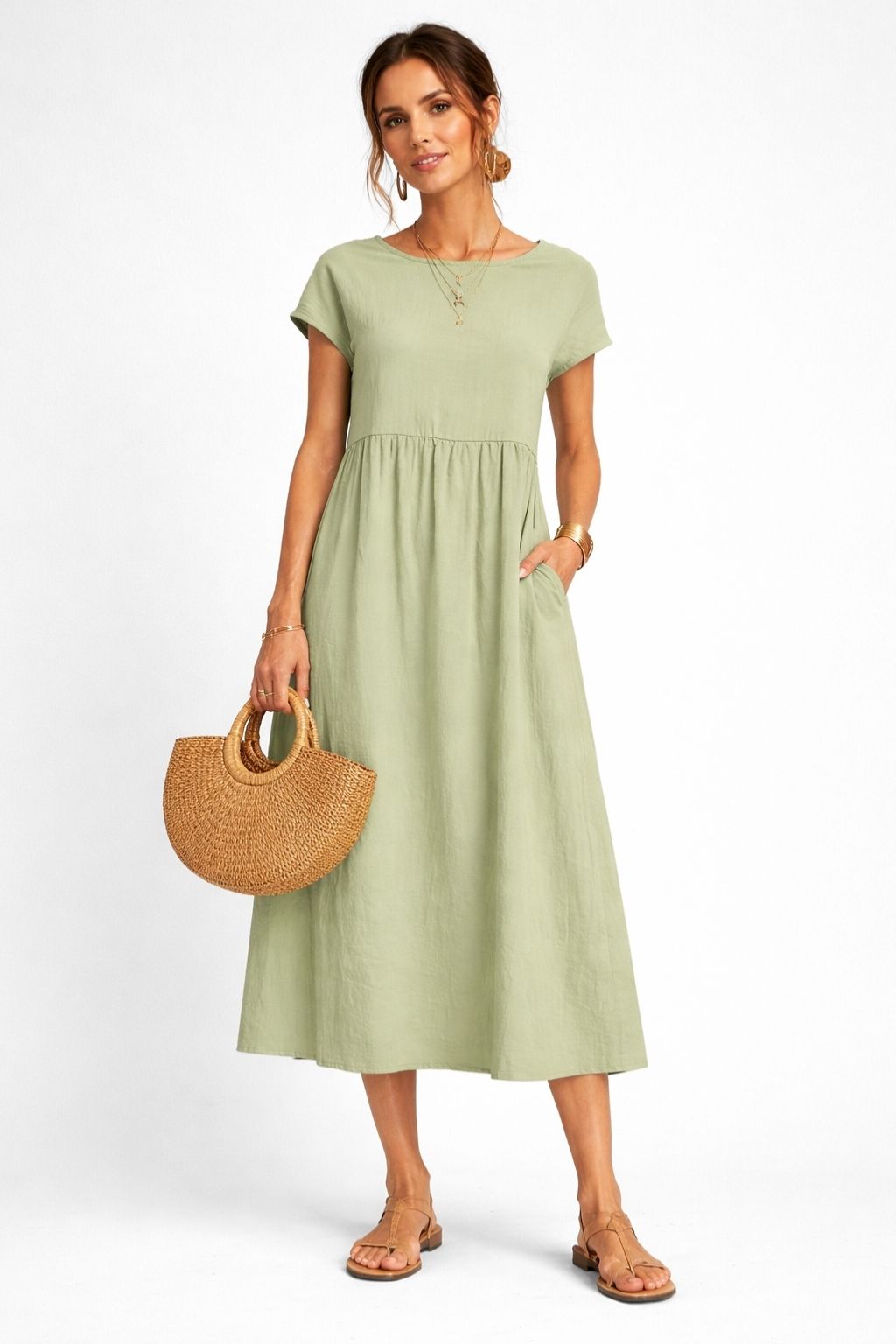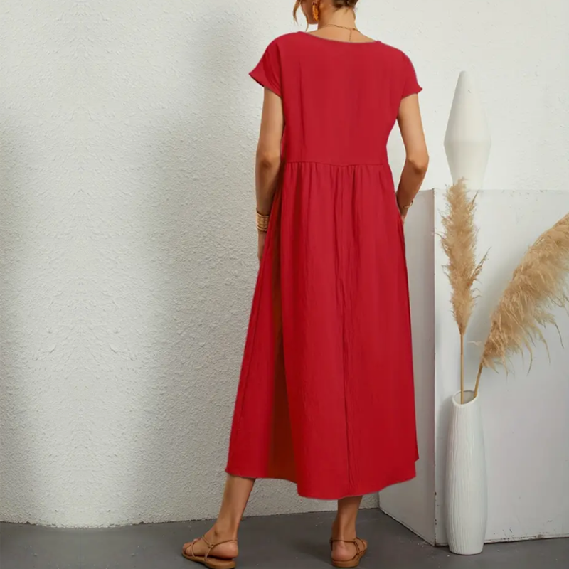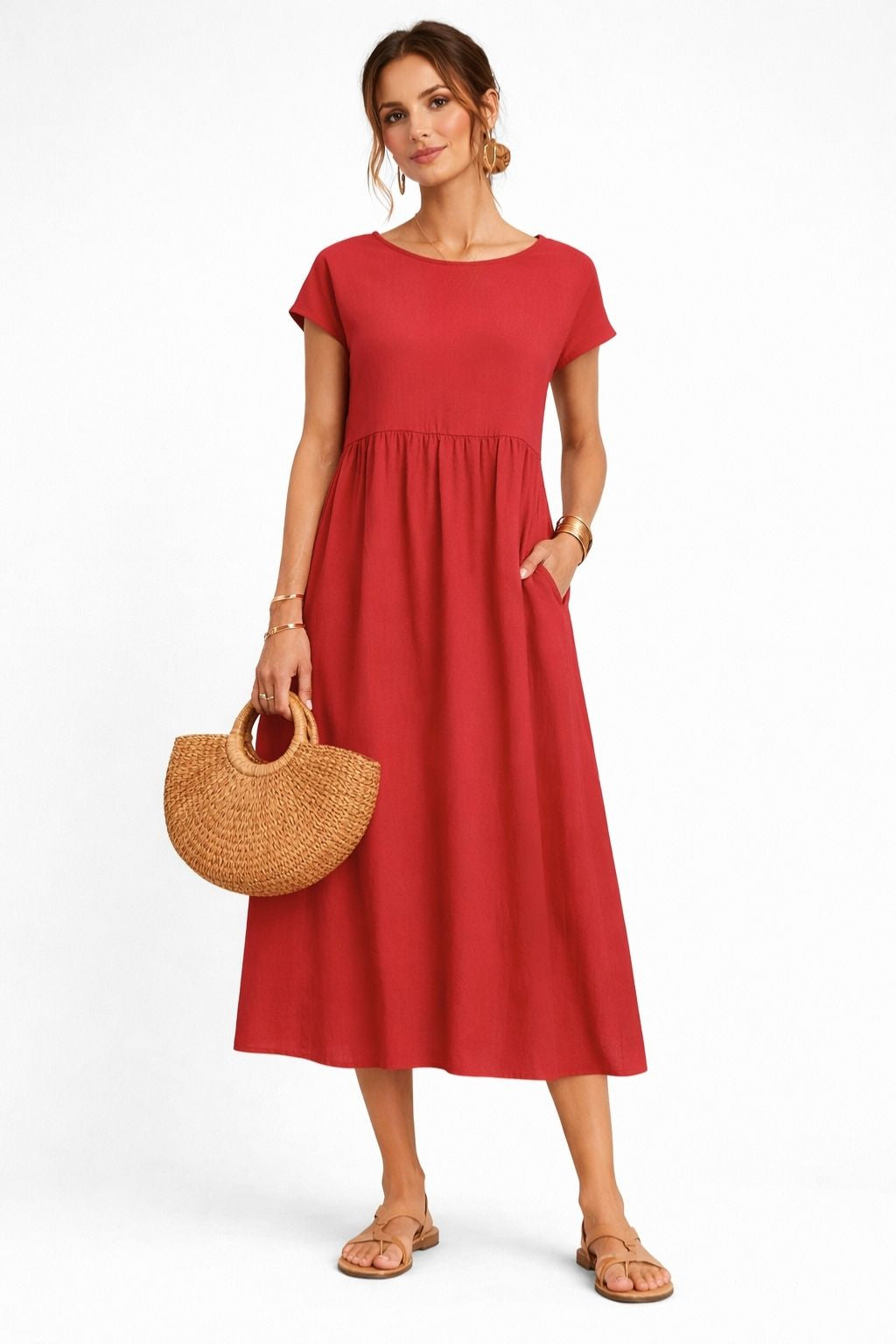 Adicione o Vestido Feminino Midi Manga Curta Pamela ao seu guarda-roupa e desfrute de uma peça que combina estilo, conforto e durabilidade!